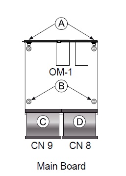 5. 进行下列电缆连接:将OM-1 模块上的左连接器与主板上的CN9 连接(65 毫米扁形电缆)Ⓒ。将OM-1 模块上的右连接器与主板的CN8 连接(190 毫米扁线电缆)Ⓓ。